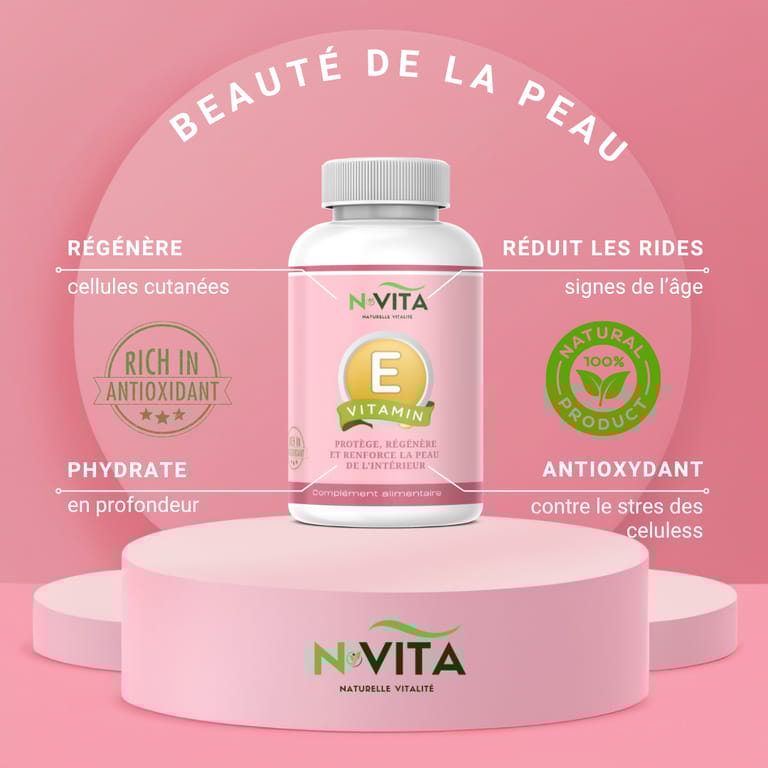 Vitamine E , le complément alimentaire idéal pour une peau éclatante et protégée. ce complément renforce la barrière cutanée, régénère les cellules en profondeur et préserve votre beauté naturelle.